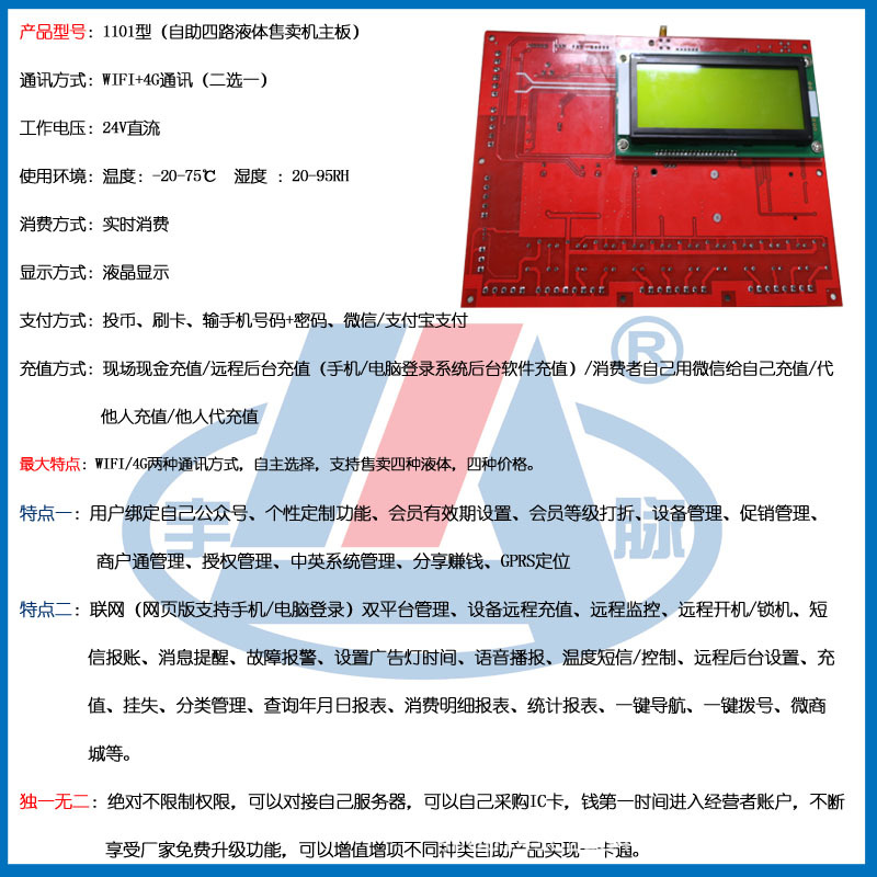 宇脉电子主控板厂家,从03年开始做单片机开发,真正拥有自己的单片机研发团队,主控设备稳定灵敏,联网多功能自助设备,支持定制开发, 24h无人自助售卖机器,宇脉自助四路液体售卖机控制板,支持售卖4种液体,四种价格,自主设置,支持刷卡、投币、扫一扫、微信、支付宝支付,联网远程管理,实时查看设备状态,查看年月报表,销售报表,等多功能主板。欢迎来电咨询:18520500709/400-1898-020